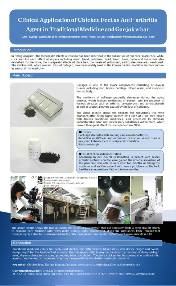 ¿·ÀÇ »çÁøÀº ´ß¹ßÀ» 10:1 ºñÀ²·Î °¨¾Ð³óÃàÇÏ¿© ±× ±³Áú¿¡ ÇѾàÀ縦 È¥ÇÕ ÈÄ °¡°øÇÑ È¯Á¦·Î ´ß¹ßÀÇ ³¿»õ ¹× ºÒÄè°¨, À̹°Áú µîÀ» ¾ø ¾Ö°í È¿´ÉÀ» ¹è·Î Áõ°¡½ÃÄÑ 2008³â ÇÑÇØ µ¿¾È ³»¿ø ȯÀڵ鿡°Ô ó¹æµÇ ¿ì¼öÇÑ Ä¡·áÈ¿°ú¸¦ ¾ò¾ú´Ù.
